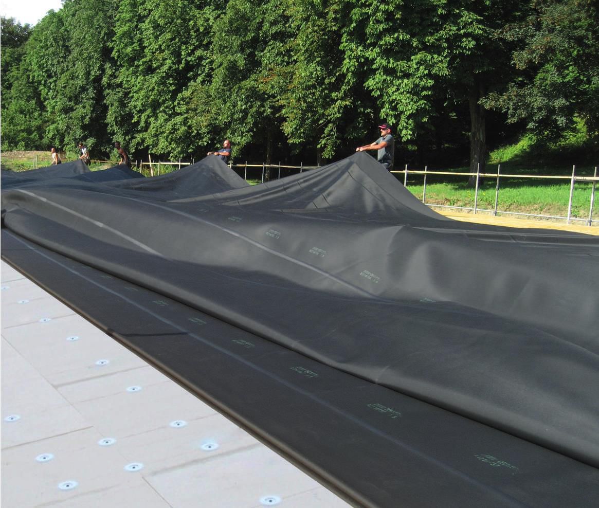 Le singole membrane EPDM sono saldate l’una all’altra durante il processo di incollaggio a caldo nella struttura prefabbricata della fabbrica. La quantità di saldatura continua sul cantiere è quindi ridotta al minimo.